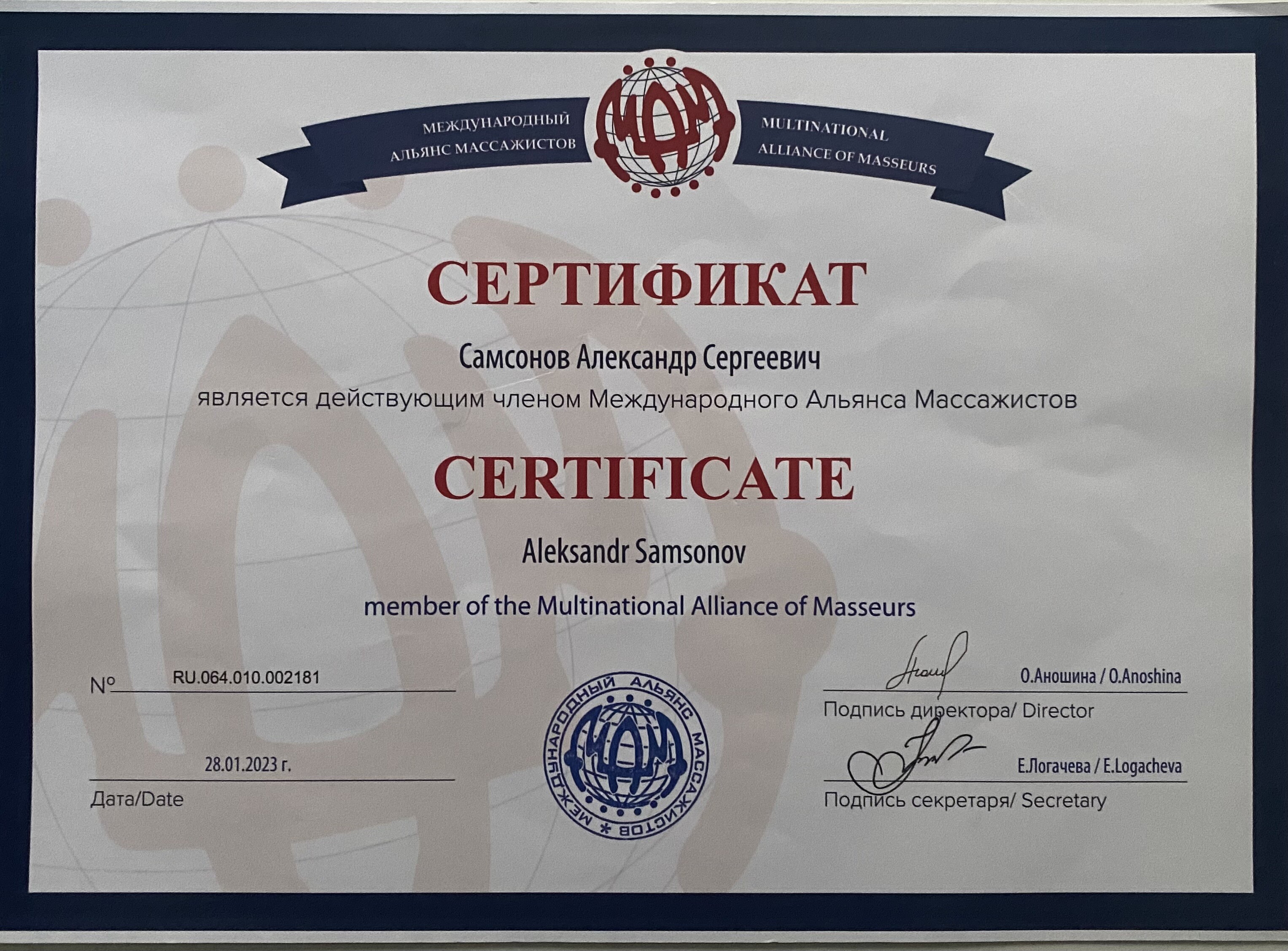 Член ассоциации Международного Альянса Массажистов .
